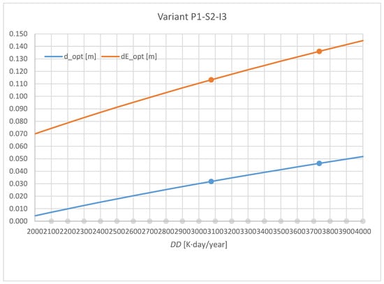 Optimal thermal insulation thickness dopt and dEopt depending on the degree days DD for the P1-S2-I3 variant.