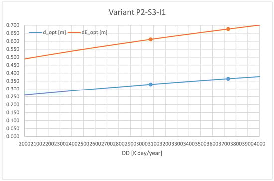 Optimal thermal insulation thickness dopt and dEopt depending on the degree days DD for the P2-S3-I1 variant.