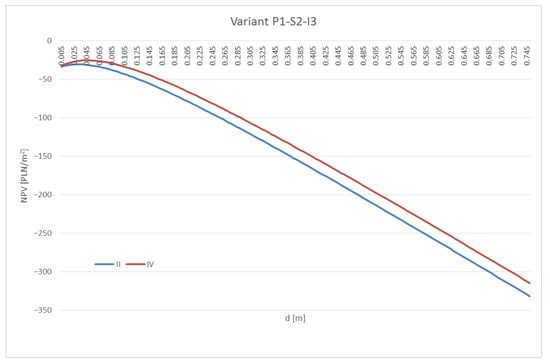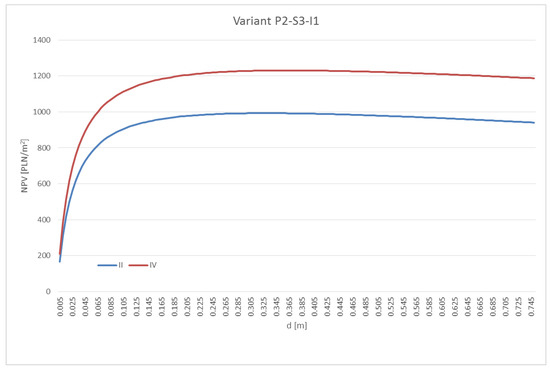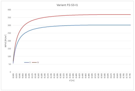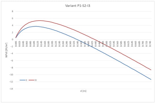Figure 6 shows the NPVE(d) graph for the P1-S2-I3 variant. According to the results presented in Table 8. the maximum NPVE value in zone II is reached for dEopt = 0.113 m, and in zone IV for dEopt = 0.136 m. Due to environmental reasons, the investment is profitable. The maximum value of NPVE is positive (approximately 3.7 Pt/m2 for zone II and approximately 5.3 Pt/m2 for zone IV).