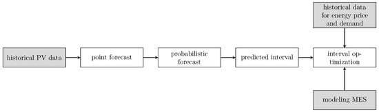 In general, there are two different approaches for obtaining probabilistic forecasts and generating uncertainty intervals afterwards: the parametric approach and the non-parametric approach. In the parametric approach, either a distribution function is fitted to the data, or the distribution is built around the point forecast. In [13], a t—location-scale distribution was fitted to obtain a probabilistic forecast of the wind power generation in an MES. However, in [1], the uncertainty interval was obtained from a building distribution function around the point forecast of wind power to be used in the scheduling of MES. In the second approach (non-parametric), no assumption is required on the type of the distribution of the stochastic variable, and the predictive distribution is obtained via a quantile function. A deep-learning-based probabilistic forecast was proposed in [26] to predict the intervals of wind power and the PV system. However, most of the forecasting techniques for renewable energy systems depend on weather forecast data, whereas for the scale of one system, weather forecast data are not freely and easily available [27]. As a result, a method that can predict interval numbers (predicted interval) and that is independent from the weather forecast needs to be proposed.