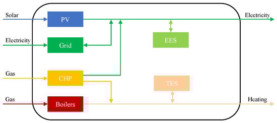 A large number of research projects have been conducted on the optimal scheduling of MESs in order to reduce the operational cost. An input–output model was introduced by Geidl et al., which links the input energy carriers to output energy carriers by a coupling matrix and so-called “energy hub” [7]. The energy hub model was used in [5,8,9] to optimally design and operate an MES, including some energy generation units and energy conversion units. In fact, the energy hub concept can be counted as an aggregation model of an MES, which can be useful in some applications [2]. However, in the energy hub approach, the model is based on aggregating different energy flows in a coupling matrix, which brings non-linearity to the model, because of the multiplication of variables, and increases the complexity of the problem. Therefore, a disaggregated model of the MES can lead to a more tractable problem [10].