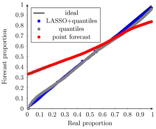 To evaluate the performance of the proposed probabilistic forecast, the calibration (reliability) is used [36].