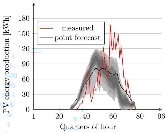 After obtaining the quantiles of the error, the day-ahead quantile function of PV energy generation at time step t can be calculated by