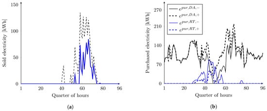 Figure 6 shows the optimal electricity interaction with the main grid. In day-ahead optimization, the injected energy is zero, while the real-time injected energy is shown in Figure 6a. As can be seen, the lower bound and the upper bound of real-time injection follow the day-ahead PV uncertainty. Due to the error in forecasting PV generation, there is more PV energy generation in the afternoon in real time. The bounds of the real-time purchased energy (Figure 6b) also depend on the uncertainty of the PV energy system. However, as shown in Figure 6b, the bounds for day-ahead purchased electricity do not only depend on PV uncertainty but also are affected by electricity price. The difference between lower and upper bounds of this parameter can be seen early in the morning when the electricity price is low. As the uncertainty of the PV system has an influence on the interaction of energy with the grid, the EES behavior is also affected by this issue (see Figure 8a).