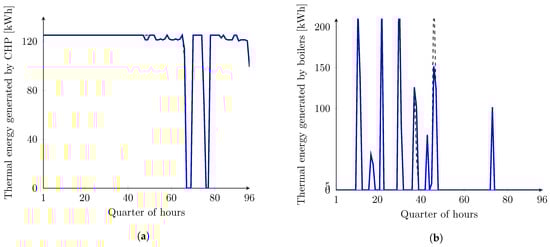 The behavior of boilers and the thermal part of CHP is shown in Figure 7. These two units should supply the thermal demand of the site. As can be seen, CHP behavior is affected by PV uncertainty during the day. These changes also have an influence on the behavior of the two boilers and the TES (see Figure 8b). Since, in lower bound analysis, there is more PV generation compared to the upper bound analysis during the day, the CHP unit generates less energy (both thermal and electrical) during the day (also less energy stored in the TES in Figure 8b). However, in the evening, the CHP generates more energy in the lower bound analysis to supply the demand. Therefore, the uncertainty of the PV system shifts the generation of the CHP and boilers. However, the total generation of these units are constant in the lower and upper bounds analysis during one day.