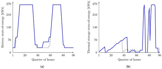 The state-of-energy for energy storage devices under a 30% uncertainty level for 27 September 2019. The dashed and solid lines represent upper and lower bound analysis, respectively. (a) State of energy for the EES under 30% uncertainty; (b) State of energy for the TES under 30% uncertainty.