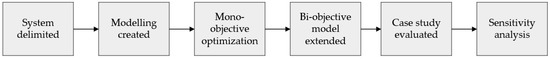 Within the context of this study, the ε-constraint method was identified as a useful method. This method allows the adaptation of an existing mono-objective optimization in a simple way to a MOO, especially for the case of bi-objective studies. Proposed by Haimes in 1971 [37], it is within the group of scalarization methods that imply the formulation of a model to solve a multiobjective problem through a scalar function [38]. These methods incorporate parameters, which are the constraint limits that can be adjusted to reflect the preferences of the decision-maker. The ε-constraint method modifies one of the targets into a constraint limited by the coefficient ε. It consists of carrying out multiple iterations for different values of the limitation ε and thus originating a discrete set of solutions belonging to the Pareto front.