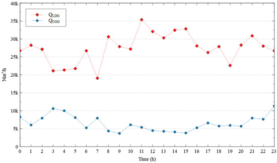 The availability of natural gas and COG was continuous and constant, however, the LDG was produced intermittently and discontinuously depending on the manufacturing process in the steel mill where it is captured and transported to a gasometer, as depicted in Figure 2. Therefore, the first restriction refers to the fact that LDG consumption must not exceed the gasometer’s amount available at any time: