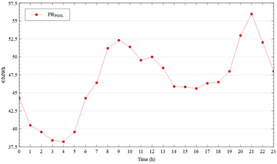 - Reward obtained for electric power (REE): the electric production is multiplied by the market price of the electricity, PPOOL[t]. The price is determined by the day-ahead market that aims to carry out electrical energy transactions for the twenty-four hours of the following day.