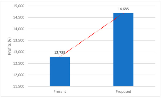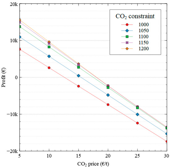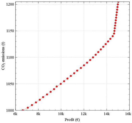 At first, the problem is modeled with CPLEX as a mono-objective optimization for the optimization (maximize) of the profit, as described in Step 3 of the method. Then, CO2 emissions are turned into a variable that is varied through its valid range, stepping ε-times each iteration, as described in Step 4. In this case, CO2 was studied in the range of 1000–1205 tons, with a step size of 5 tons. The Pareto front was subsequently built, as presented in Figure 6. Under these conditions, the ε-constraint algorithm presents a range for profit starting at 6734 € and reaching the maximum value at 15,020 €/day. As expected, the tons of CO2 produced was a monotonic increasing sequence, but a remarkable point was found in the inflection of 1145 t.