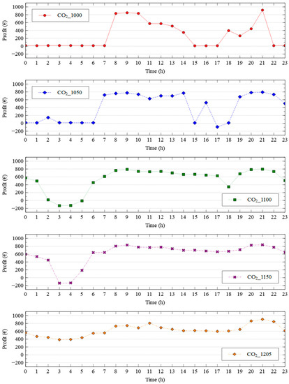 Figure 7 presents part of the different solutions obtained by applying the scalarization technique described above, in this case, stepping 50 t. For greater ease of visualization of the results, part of the solutions of the Pareto front has been represented for different values of CO2 emissions from the industrial process. The benefits and distribution of steel gases are plotted. As can be seen, the hours of greatest benefit coincide with the peak hours of the electricity market, and, therefore, the LDG is used mainly to produce electricity. However, as the restriction of CO2 emissions increases, the profits are much more continuous and stable during all hours, with an approximate value of 700 €/h. The consumption of COG increases and displaces the consumption of LDG to guarantee the supply of thermal energy. This also explains the behavior of the graph at the inflection point, caused by the increase in fuel costs due to the contribution of COG as the main fuel for the production of thermal energy and the consequent drastic decrease in profits.