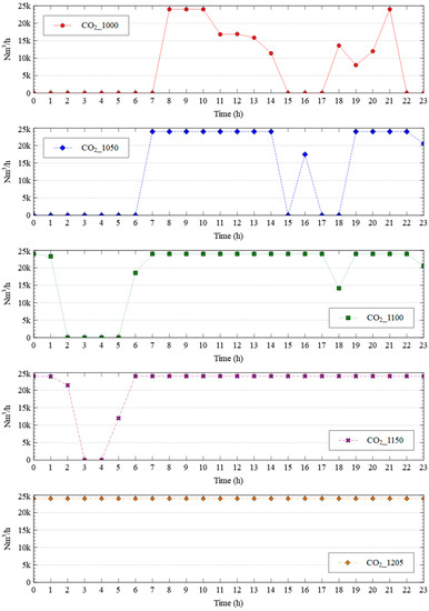 Figure 3, Figure 4 and Figure 5 present the available steel gas flow rates, the steam demand for the steel process, and the electricity market price, respectively, during the analyzed period.