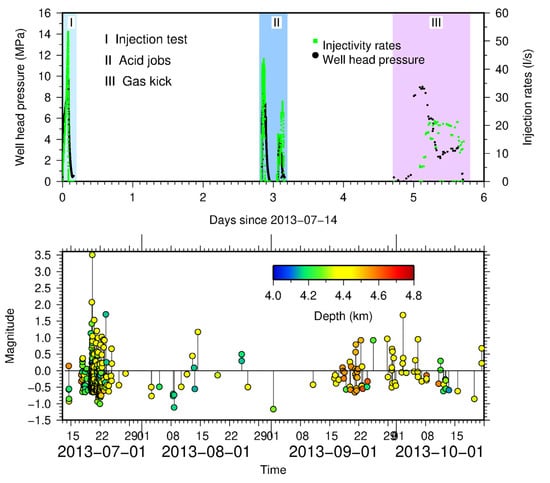 Data analyzed in this study have been collected by Swiss Seismological Service in 2013 (from 2013-07-14 to 2013-10-22) during the well control measures after drilling and acidizing the GT-1 well (see Figure 1). The project started on 14 July 2013 with a stimulation phase during which a test of injection with flow rates of up to 53 l/s was performed. The resulting maximum pressure increase was 9.8 MPa e.g., [21,22]. For this phase 175 m3 of water were injected into the reservoir over a 2 h period. On 17 July 2013, an acid stimulation was performed with a 290 m3 of fluid injected. Well head pressure and injectivity rates during different phases of the project as reported by Moeck et al. [21] are shown in Figure 2 together with the temporal evolution of seismicity.