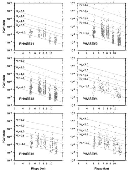 Peak-ground velocities (PGVs) as function of the hypocentral distance for each of the six phases of the project analyzed in the present study. In each panel, the continuous lines refer to the GMPEs whose coefficients are listed in Table 1 evaluated for = −1.0, 0.5, 1.0, 2.0 and 3.0.