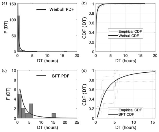 Inter-arrival times distribution. The left column reports the distribution (in terms of frequency F) of the inter-arrival times DT. Panels (a) and (c) correspond to the phase 2 and phase 4, respectively. The black line depicts the best fit distribution, which corresponds to the Weibull PDF in panel (a) and to the Brownian Passage time PDF in panel (b). Panels (c) and (d) show the cumulative distribution used for the Kolmogorov-Smirnov test. The dashed lines represent the confidence bound.