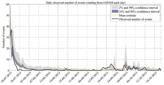 The statistics of the daily number of events having magnitude greater than the cut-off magnitude N(m ≥ Mct|seq,Mct), Mct = −0.5 in the period starting from first forecast interval: 2013-07-20 6:00 A.M.–2013-07-21 6:00 A.M. (24 h) to the last forecast: 2013-10-22 6:00 A.M.–2013-10-23 6:00 A.M. (24 h). The statistics are represented by the 2nd–98th (grey area) percentiles and 16th–84th (blue area) percentiles confidence intervals and the mean (expected value from Equation (5)). The reference time is To = 2013-07-14 at 12:00. The evolution of the observed number of events is shown with black-solid line.