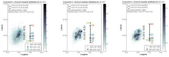 Figure 6 depicts the seismic events of interest that occurred in the corresponding forecasting interval [Tstart, Tend], shown as colored squares and dots (distinguished by their magnitudes). The results in Figure 6 indicate that the ETAS model captures properly the spatial distribution of seismic events taken place in the forecasting time interval. Inside each sub-figure of Figure 6, the observed (shown as a green star) vs. forecasted number of events (shown in an error-bar format) is illustrated for events with M ≥ Mct = −0.5 for the entire zone of seismic activities. It is to note that to retrospectively perform robust seismicity forecasting within the seismic sequence, we set Mct = −0.50 to be consistent with Table 2. However, this assignment has been verified based on the two procedures adopted for evaluating the completeness magnitude within a seismic sequence in the Electronic Supplementary Information in Ebrahimian and Jalayer [46].