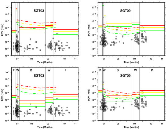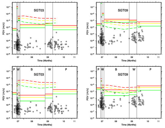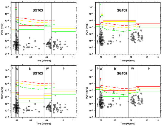 We compute seismic hazard, expressed as PGV corresponding to given probability of exceedance levels at two selected stations SGT03 and SGT09 (see Figure 1). We considered three probability of exceedance levels: 10%, 20% and 50% and three exposure periods 15 days, 1 month and 2 months compatible with the duration of the project. We compare the results obtained by using the standard Poisson model, the model inferred for each phase, and the ETAS model. As for ETAS, in order to be consistent with the selected exposure times, we use the mean daily forecasted seismicity to compute the monthly rate. The recorded PGVs as function of the time at the two selected stations are shown in Figure 7, Figure 8 and Figure 9 for exposure times of 15 days, 1 month and 2 months, respectively. The figures demonstrate that in some of the considered periods the recorded values tend to 5 mm/s for which damage to ordinary buildings is deemed possible [55]. The PGV values obtained from the hazard analysis together with the associated probability of exceedance are shown as horizontal lines.