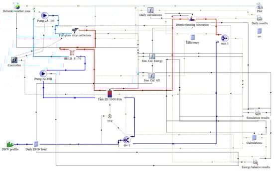 Scheme of the model of SDHW system developed in the TRNSYS software environment.