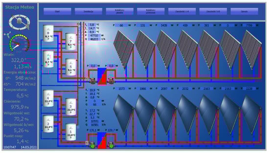 As is well known, even a precisely developed numerical model may be inaccurate. Therefore, it was decided to compare the results of computer simulations with the measurement results. The source of the measurement database was the SDHW system located at the Bialystok University of Technology (Poland). The screenshot of the automatic operating parameters recording system is shown in Figure 2. A more detailed description of this measuring stand can be found in [17].