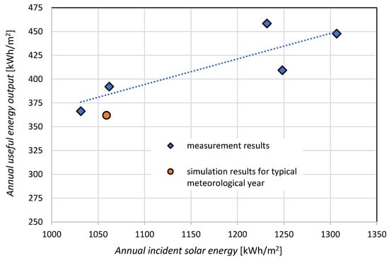 In order to estimate the accuracy of the model, the measurement results of an annual useful energy output QSC (in kWh/m2) from 5 years (2016–2020), were selected. The measurement of this value was made using a heat meter placed on the solar loop next to the heat exchanger. Figure 3 shows the amount of energy supplied by the solar collectors during the year as a function of the intensity of solar radiation QSR (in kWh/m2) incident perpendicular to the plane of the collectors (blue rhombus).