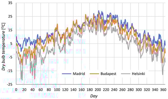 As can be seen from the characteristics presented in Table 3, the best conditions for converting solar energy into the heat exist in Madrid. This location is characterized by a high average annual temperature of the outside air, relatively low windiness, and a high value of solar radiation with a higher share of beam fraction (61%). Budapest is a city with moderate weather conditions. In this case, the total intensity of solar radiation is relatively high, but a predominance of the diffusion fraction (56%) is observed. The worst conditions in terms of installation of solar collectors are in Helsinki. There is a low outside air temperature, the lowest insolation value, and a relatively high average wind velocity.
