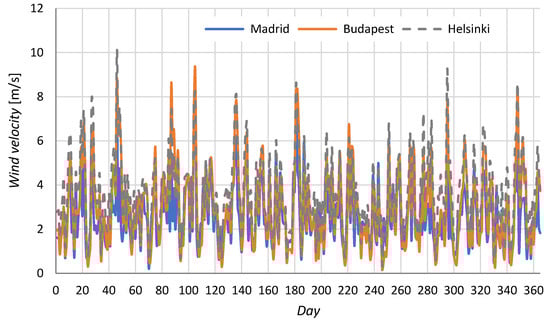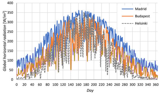 The useful energy output makes a clear physical sense and is strongly explicit. The selected factors (X1–X5) are measurable, controllable, independent, and consistent, i.e., they meet the basic requirements of mathematical modelling [19]. It should be noted that climatic conditions cannot be considered as a parameter in such mathematical models. This factor is presented by a set of various meteorological indicators, which are difficult to combine with one coherent parameter. In optimization, this is the so-called heterogeneous and uncontrollable parameter. As mentioned before, it was decided to choose three different locations: (group I) Madrid (Spain)—(QI,SC = YI,i), (group II) Budapest (Hungary)—(QII,SC = YII,i), and (group III) Helsinki (Finland)—(QIII,SC = YIII,i), the characteristics of which are shown in Table 3. The parameters listed in this table were calculated using the TRNSYS software using the data for a typical meteorological year. Additionally, three charts that show the variability of the basic meteorological parameters during the year for three selected locations are created. Figure 4 shows the average daily air temperature, Figure 5 shows wind velocity, and the distribution of total horizontal solar radiation is presented in Figure 6.