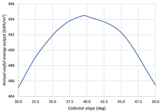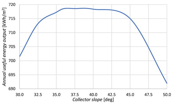Each of these locations differs in latitude and the share of direct and diffused solar radiation. Therefore, the optimal solar panel inclination angle β has been determined for each city separately. The results of the multivariate calculations are presented in the form of three graphs in Figure 7 for Madrid, Figure 8 for Budapest, and Figure 9 for Helsinki. The maximum annual useful energy output allowed to determine the optimal value of β, which is 36 degrees for Madrid, 39.5 degrees for Budapest, and 47.5 degrees for Helsinki. In the case of Madrid, we can observe an interesting phenomenon. It consists in the fact that the optimal inclination of the collector is in a wide range from 35 to 44 degrees with only small deviations. The opposite is Budapest, where we have a very clearly marked maximum.