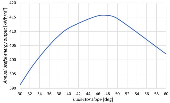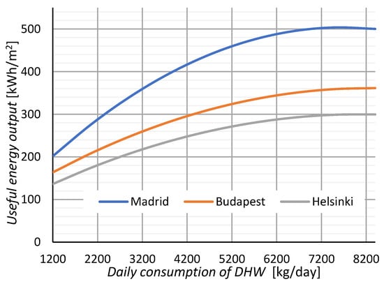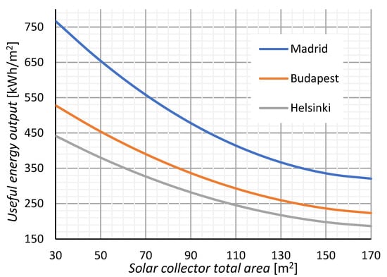 The results of the optimization procedure according to the energy criterion showed that the maximum annual useful energy output, which is possible to supply from solar collectors, is 1303 kWh/m2 for Madrid weather conditions, 918.5 kWh/m2 for Budapest, and 768 kWh/m2 for Helsinki conditions.