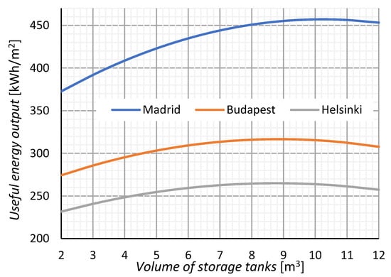 The trend of the influence of the storage tanks capacity on the collector performance (Figure 10) clearly shows that an increase in tank volume above 8 m3 does not make any practical sense in the case of Madrid, although the optimum is 10 m3. For the other two locations (Budapest, Helsinki), the maximum volume is between 8 m3 and 9 m3. However, as in the previous case, reducing the storage tank capacity by 2 m3 causes a decrease in useful energy output only by about 2.5%.