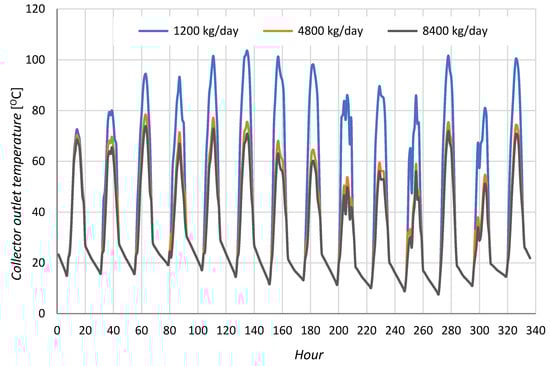 Figure 13 shows the effect of DHW consumption on the outlet temperature TOUT of the solar collectors. The calculations were made for Madrid, 30 m3 of collector area and 4 m3 of storage tank capacity in the period from 1 to 15 September. As could be expected, the highest temperature is achieved with the lowest DHW demand of 1200 kg/day. A 3.5-fold increase in daily consumption lowers TOUT value by an average of 21.2%, while its 7-fold increase reduces this temperature by slightly less, i.e., by 25%. Lowering the temperature of the water flowing out of the solar collectors will be associated of course with the need to provide more energy from a supplementary heat source.