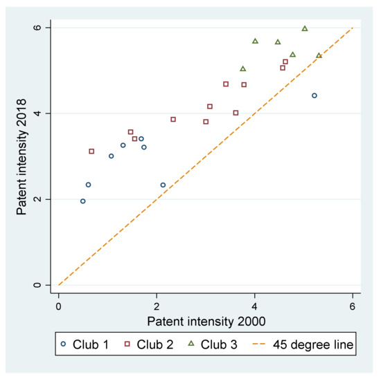 Figure 2 illustrates the change of energy patent intensities of the countries (in logs) belonging to particular clubs over the research period. As can be seen, there exists a catch-up effect, which is especially visible within club 2 and club 3, where countries with low energy patent intensities in 2000 are characterised by higher growth rates (i.e., the distances between points and the 45 degree line) than countries with medium and high energy patent intensities. Interestingly, the points representing countries of each club are distributed horizontally. Such a pattern of energy patent intensity distribution indicates indirectly the convergence processes to different steady states in each individual club. It is worth noting that in the case of club 1 the observed tendency is distorted by Luxembourg that significantly reduced patent intensity in the research period. This situation may result from the fact that Luxembourg’s energy system is characterised by high import dependence.