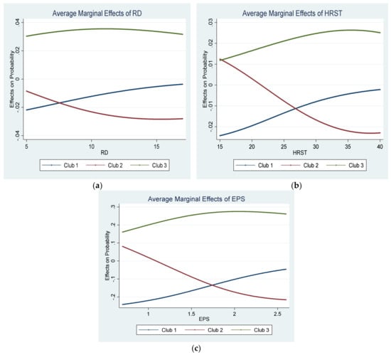In the next step, the variations in marginal effects in response to the changes in the level of club membership determinants were examined (Figure 3). It should be noted that for higher levels of HRST, marginal effects increase for club 1 and club 3, but in the former case they remain negative. A similar trend is visible for the EPS variable and to some extent to the RD variable. In the case of club 2 the sign of marginal effects of the HRST variable and the EPS variable changes when we move from low values to high values of covariates, which results in the insignificance of marginal effect averages (see Table 2).