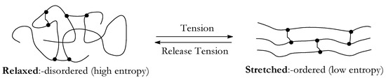Elastomers are polymers that can be stretched usually too many times their original length but quickly return to the original shape without suffering permanent deformation when the stress is removed. Elastomer comes from the word “elastic” (describing the ability of a material to return to its original shape when the load is removed) and “mer” (from polymer, in which “poly” means many and “mer” means part). Upon elongation, the polymer chains assume a more ordered arrangement that corresponds to lower entropy and results in warming of the elastomer [9]. When the stress is removed, the elastomer contracts and cools at the same time. Figure 1 illustrates the concept of elastomers.
