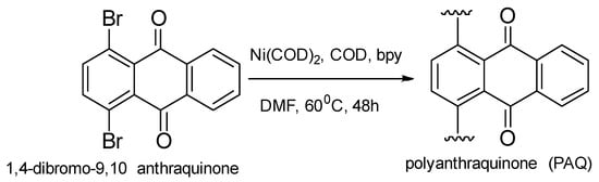 - Yamamoto, T.; Etori, H. Poly(anthraquinone)s Having a .pi.-Conjugation System along the Main Chain. Synthesis by organometallic polycondensation, redox behavior, and optical properties. Macromolecules 1995, 28, 3371–3379. [Google Scholar] [CrossRef]