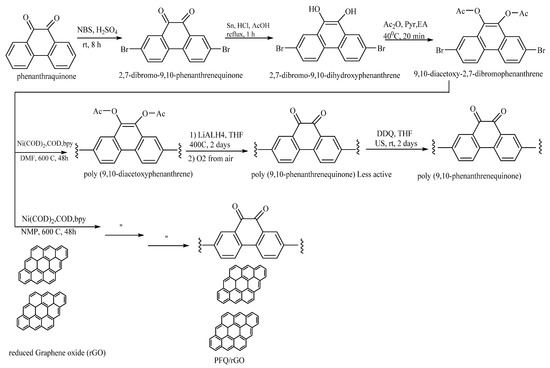 Polyanthraquinone (P.A.Q.) can be produced directly with halogenated quinone used for low voltage system (Figure 2). Still, high voltage quinone- based polymers such as poly(9,10-phenanthrenequinone) (P.F.Q.) required indirect polymerization consisting of five steps of synthesis (Figure 3). Initially, a precursor 2,7-dibromo-9,10-phenanthrenequinone, as a monomer, was prepared by using phenanthraquinone and N-bromosuccinimide (N.B.S.) in the presence of concentrated sulfuric acid (H2SO4) followed by bromination [53]. Then reduced by tin (Sn) in acidic medium (Hydrochloric acid, HCl, and glacial acetic acid, CH3COOH) and a monomer, 2,7-dibromo-9,10-dihydroxyphenanthrene was obtained [54]. Later, acetylation of this hydroxy compound monomer using acetic anhydride, pyridine, ethyl acetate produces the monomer (9,10-diacetoxy-2,7-dibromophenanthrene) [55]. Finally, a polymer poly(9,10-diacetoxyphenanthrene) was obtained using 1,5-cyclooctadiene, nickel complex Ni(C.O.D.)2 and 2,2′-bipyridyl dissolved with D.M.F. after polymerized with bromophenanthrene, [56]. This polymer was treated with lithium aluminum hydride (LiAlH4), anhydrous tetrahydrofuran (T.H.F.) in an acidic medium (HCl) resulted in less active poly(9,10-phenanthrenequinone), called PFQ_L. The final step, oxidization of less active PFQ_L to P.F.Q. (poly(9,10-phenanthrenequinone) utilizing 2,3-dichloro-5,6-dicyanobenzoquinone (D.D.Q.), as an oxidizing agent. The reduced graphene oxide (rGO) was prepared by incorporating graphene oxide with potassium permanganate and H2SO4, H3PO4, HCl, H2O2, and hydrazine hydrate [57]. The composite (rGO-PFQ) was produced by adding rGO during the polymerization reaction with 9,10-diacetoxy-2,7-dibromophenanthrene in the presence of Ni(C.O.D.)2 and 2,2′-bipyridyl [58].