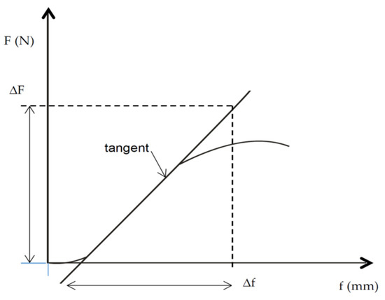 where F is the breaking force in (N), L is the support distance in (mm), b is the width (mm) of the specimen in (mm), h is the thickness of the specimen in (mm), ΔF/Δf is the slope of the force-deflection curve. The load is applied at the specimen’s center under standardized bending speed, temperature, and humidity. It is upon the most common type of loading encountered and essential in determining the polymer’s characteristic values. The initial flexural modulus can be calculated using a slope of the line measuring Δf and ΔF as presented in Figure 7, depicting a typical force bending flexural test.
