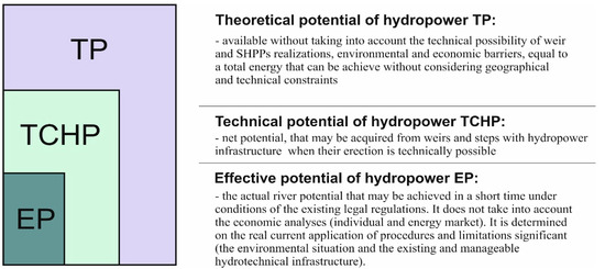A brief overview of the literature shows that this term is usually not universally accepted. Most authors come up with their own definitions that are mostly not well explained, sometimes seemingly simple but difficult to understand and to generalize [7]. Many authors use interchangeably the names and definitions of RE potentials, leading to many misunderstandings and mistakes. Table 1 presents intuitively similar definitions of hydropower potential; however, many of them existing in science provide no clarity on assessed values, and their authors often do not put forward any clear methods for quantifying the numerical values of the proposed hydropower potentials.