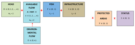 Based on a wide review of the existing literature on the subject, the author has selected the most often met conditions to implement SHPPs, namely environmental impact, government support (certificates, price of electricity generation or other extra payment), availability and technological limitations, hydrology (available flow), and social impacts [28,29,30,34,35,36,37]. Only those conditions that are the most useful have been selected to create the proposed universal HAFIPES system (from the above list).