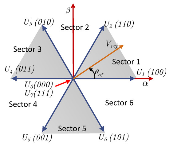 Similarly to the SVM, the space VVs of the power inverter can divide the plane as shown in Figure 1. The sector m where the reference voltage vector lies can be used to select the two nearest adjacent VVs to synthesize the final VV. The angle of the reference stator voltage vector can be calculated as