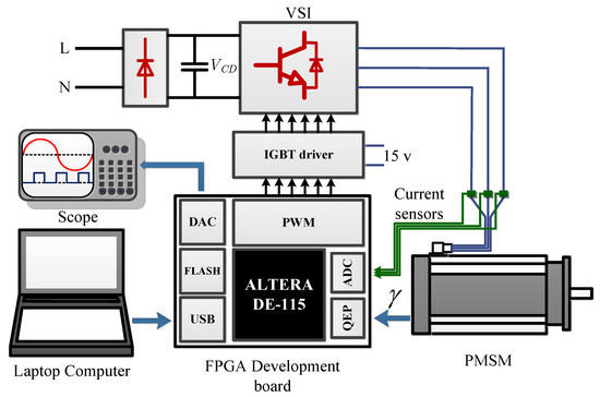 A simplified diagram of the experimental setup is shown in Figure 3. The experimental validation is carried out in a surface PMSM connected to a SEMIKRON two level voltage source inverter. The nominal parameters of the machine used are shown in Table 1. The control is implemented in an FPGA development board with a Cyclone IV EP4CE115. Currents are measured using the LTS-25np hall sensor, and the position is obtained from a quadrature encoder of 2024 ppr. The voltage of the DC bus is set at 300 VDC. The sampling frequency of the evaluated control schemes is set at 18 kHz. In the experimental results, the currents are directly measured by a current probe, and the waveforms of the remaining variables are shown in the scope through the digital analog converter (DAC) of a custom board. In order to perform a comparison, the conventional deadbeat controller is implemented and compared with the proposed deadbeat controller. The control algorithms are implemented using VHDL code with an architecture based on 32 bits fixed point (1 bit for the sign, 15 bits for the real part, and 16 bits for the decimal part).