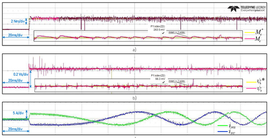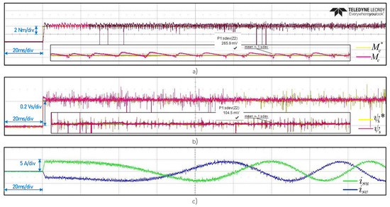 In this experimental evaluation, the torque reference is set from 0 to 4 Nm; and the flux reference is set to 0.22 Vs. The reference flux has been calculated according to the maximum torque value. The experimental results shown a fast dynamic torque and flux response, which successfully follows the torque and flux reference. In Figure 4a and Figure 5a, the torque response reach the reference value in approximately 2 ms for both controllers. According to the scope measurements, the torque ripple of the conventional deadbeat control is equal to 0.265 Nm, and for the proposed deadbeat control is 0.254 Nm. In a similar way, in Figure 4b and Figure 5b the flux response reach the reference value in less than 1 ms. It can be observed some noise introduced in the flux measurement, this is attributed to the low resolution of the DAC used. In the flux results, a flux ripple of 0.104 Vs is obtained in the conventional deadbeat control, and a flux ripple of 0.098 Vs is obtained for the proposed deadbeat control. A detailed response of the machine variables is shown inside Figure 4a,b and Figure 5a,b, where a zoom is shown in the bottom of each figure. It can be noted that the torque and flux of the machine follow the reference successfully.
