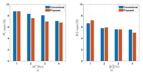 Steady state experimental evaluation of the conventional and the proposed deadbeat control. (a) Electromagnetic torque ripple percentage. (b) Stator flux ripple percentage.