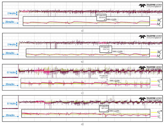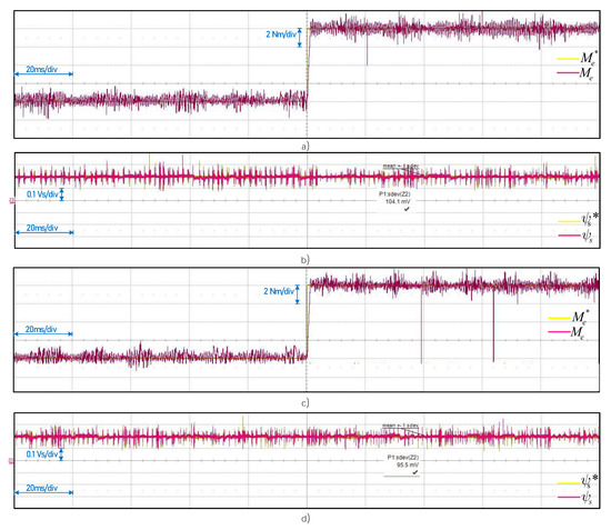 Dynamic state experimental results. (a) Electromagnetic torque conventional deadbeat control. (b) Stator flux conventional deadbeat control. (c) Electromagnetic torque proposed deadbeat control. (d) Stator flux proposed deadbeat control.