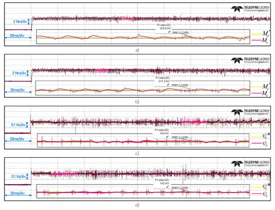 Finally, the experimental results when the parameters of the PMSM are varied 80% from nominal values are shown in Figure 9. In this evaluation, the torque response of the conventional and the proposed deadbeat controller follows the reference successfully as shown in Figure 9a,b, however, the torque ripple is increased to 0.320 Nm and to 0.318 Nm for the conventional and the proposed deadbeat control, respectively. In this evaluation test, the flux of the PMSM is considerable affected by the parameter variation. In this test, the flux ripple of the conventional deadbeat control is equal to 0.621 Vs, and for the proposed deadbeat control is equal to 0.607 Vs. It can be seen that the proposed control is less affected by parameter variations.