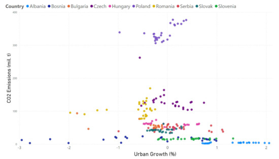 For most of the country clusters, the data points show steady values regardless of the value of the urban growth, with two exceptions: (a) Poland, that clearly displays a linear increase of the CO2 emissions when the urban growth rate is increasing; (b) Czech Republic that shows a descending trend of the emissions, while the urban growth rate is increasing.