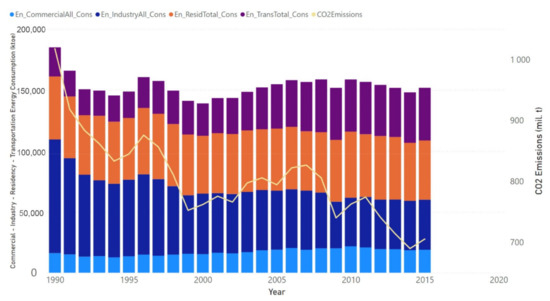 As it can be observed (Figure 3), the structure of the energy consumption is changing along the analyzed time interval, as the industrial consumption is declining in a fashion determined by the structural economic developments. Thus, the carbon emission curve evolves mostly in connection with the industrial energy consumption, while the total energy consumption is not displaying a clear ascending or descending trend.