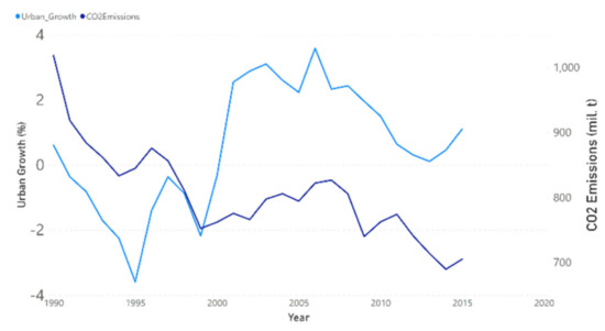 Urbanization as a process, but also as a way of human life, is strongly connected with high energy demand. According to some studies [17,18,19], extensive energy consumption, especially non-renewable energy, causes urbanization to decrease environmental quality via increased CO2 emissions. Also, other authors [20] characterized the urbanization negative effect as being heterogeneous across various quantiles of urban development.