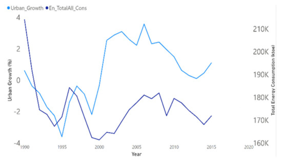Economic growth and urbanization are related to high energy consumption even in terms of industrialization or households’ consumption behavior. Previous studies show a positive correlation between economic growth and energy consumption [39,40,41,42,43,44]. More recent research shows no long-run relationship between the two [45] or even suggesting that renewable energy consumption has a more effective impact on the economic growth [46,47].
