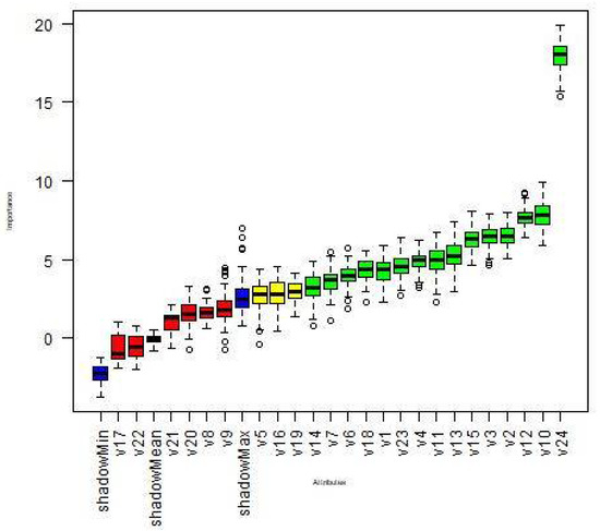 The resulting graph (Figure 1) generated using the BORUTA package in the R environment, after features classification, indicated the importance (axis Y) of the analyzed features (put on axis X) by ranking and color-coding them. From the box-plot, the blue box-plots correspond to the shadow features. We have three blue box-plots for minimum, average, and maximum shadow feature values. The green box-plots correspond to features that were confirmed as valid features, and the red box-plots correspond to features that were confirmed as irrelevant features. The yellow box-plots correspond to features that are uncertain, i.e., the algorithm was not able to come to a conclusion about their importance.